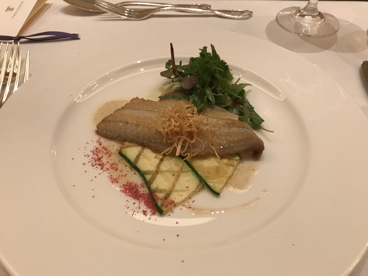 そんなことを考えているうちに、メインの一皿目。舌平目のムニエルである。キューリに焼き目を付けたものを台替わりに、ヒラメの切り身が「美味しいよ」と言っているように思えた。白ワインもまだ十分残っているし、少しずつ削りながらワインで流し込んだ。ほんのりバター味がしたが、舌触りはとても柔らかい。