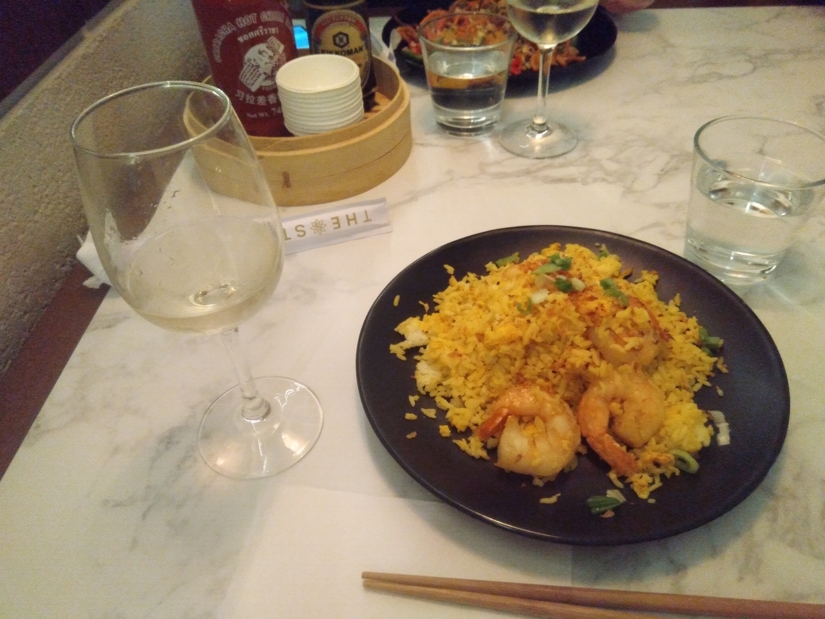僕が頼んだのは海鮮炒飯、大振りのエビが4尾入っている。これで$18(約2,000円)。高く思えるが諸税も含まれているし、街中のテイクアウトでも$10のランチが望めないほどの物価高なので、納得できてしまう。隣の人は「カジノがあるので、レストランは安めに設定していますね」という。